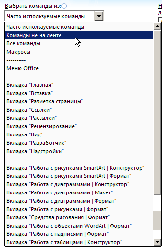 Рис. 1.15. Выбор варианта Команды не на ленте в списке Выбрать команды из