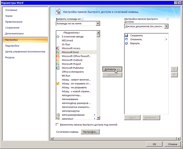 - В появившемся окне Настройка панели быстрого доступа и сочетаний клавиш раскройте список Выбрать команды из и выберите вариант Команды не на ленте (рис. 1.15).