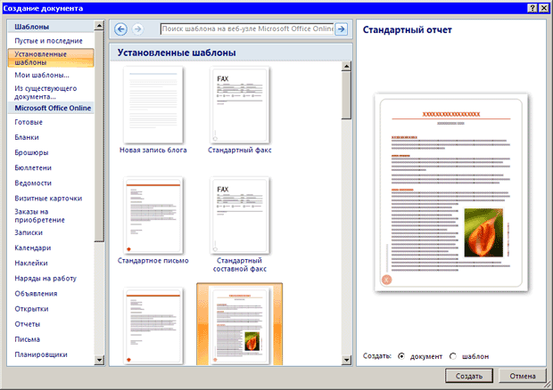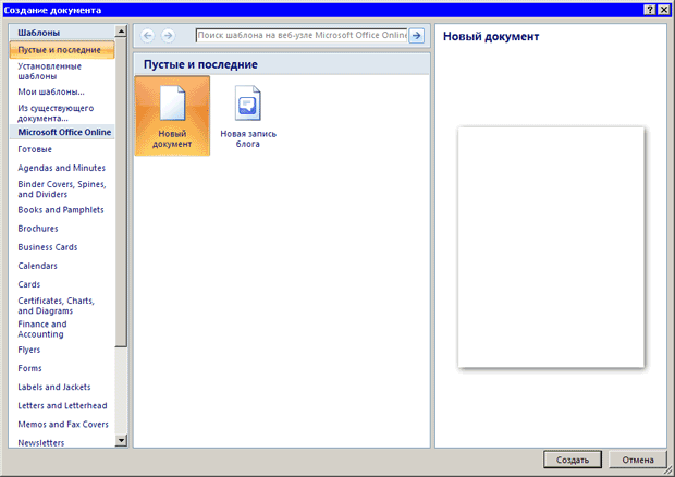 В разделе Пустые и последние, который открывается по умолчанию,доступно два типа документа: Новый документ — простой документ,который создается на основе шаблона Normal, и Новая запись блога –документ, позволяющий создать запись в блоге.