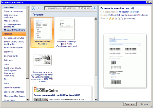Если необходимый шаблон отсутствует, но компьютер подключен к Интернету, то можно воспользоваться поиском шаблона на сайте Microsoft. Для этого нужно перейти в один из разделов, которые отделены ссылкой Microsoft Office Online. Если вы хотите использовать шаблон, размещенный на сайте Office Online, его необходимо будет загрузить на компьютер. Просматривая эскизы, вы сможете посмотреть, каков размер шаблона, сколько времени потребуется на загрузку, и тут же скачать его, нажав кнопку Загрузить (рис. 2.4).