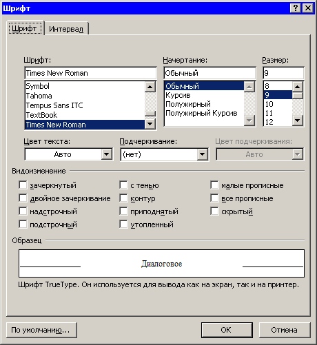 Диалоговое окно Шрифт имеет две вкладки: Шрифт и Интервал. Рассмотрим доступные параметры.