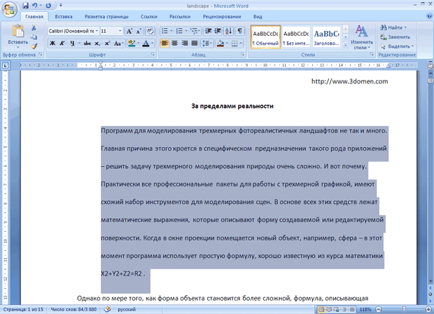 - Выделите первую букву следующего абзаца и перейдите на вкладку Вставка на ленте. Нажмите кнопку Буквица в группе Текст и выберите команду Параметры буквицы. В диалоговом окне Буквица выберите параметр на поле. Высоту буквицы в строках установите равной 3. Убедитесь, что первая буква слова преобразована в буквицу (рис. 4.41)