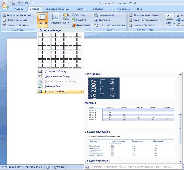 - Нажмите кнопку Таблица в одноименной группе на вкладке Вставка на ленте и выберите команду Экспресс-таблицы. Ориентируясь на названия и значки предварительного просмотра, выберите подходящий стиль таблицы (рис. 5.4).
