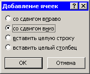 - В диалоговом окне Добавление ячеек (рис. 5.10) укажите, как нужно произвести вставку: