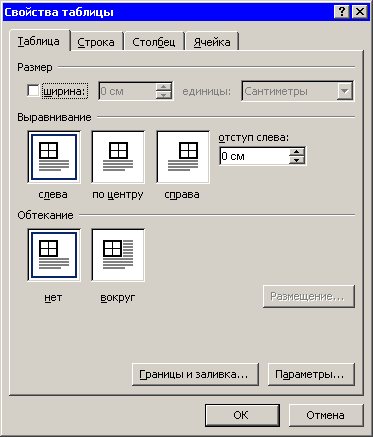 В диалоговом окне Свойства таблицы можно определить следующие параметры: