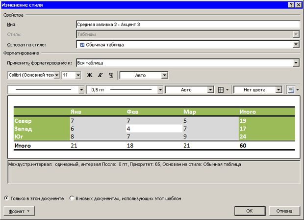 Для создания нового стиля таблицы воспользуйтесь командой Создать стиль таблицы в меню стилей. В диалоговом окне Создание стиля можно выбрать тип, цвет линии, заливку, гарнитуру, кегль шрифта и др.