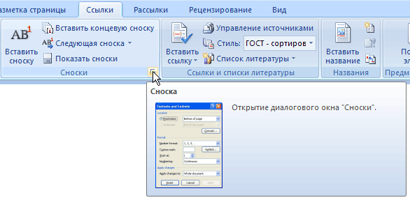- Нажмите кнопку в виде стрелки, направленной вниз, в нижней части группы Сноски (рис. 7.3).