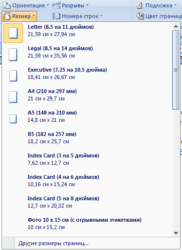Кнопка Размер, которая также расположена в группе Параметры страницы, позволяет задать параметры листа, на котором будет производиться печать (рис. 8.6).