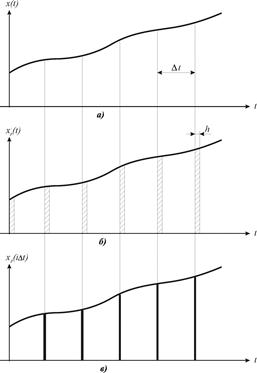 Пусть x (t) – входной сигнал элемента представляет собой решение дифференциального или интегро-дифференциального уравнения (рис. 5.10а). На выходе ключа имеем сигнал xp(t), представленный на рис. 5.10б, т.е. последовательность импульсов длительностью h, где h – время замыкания ключа. Если h <<D t, то временем замыкания ключа можно пренебречь, что показано на рис. 5.10в.