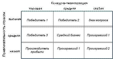 Кроме того, в отличие от матрицы BCG, в матрице McKinsey вводятся средние значения параметров. Таким образом, матрица состоит из 9 ячеек. СЗХ в трех из них характеризуются как «победители» или наиболее желательные сферы бизнеса. Три ячейки характеризуются как «проигрывающие», которые наименее желательны для бизнеса (рис. 12.4).