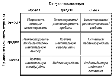 Матрица разработана в 1970-х гг. компанией McKinsey совместно с корпорацией GE. В матрице используются те же параметры, что и в матрице BCG, однако особенностью этой модели является то, что в ней впервые стали рассматриваться комплексные факторы: рынок описывается не только темпами роста, а с помощью агрегированного показателя «привлекательность рынка», а позиция СЗХ определяется не только на основе относительной доли рынка, а через комплексный показатель «конкурентный статус» (табл. 12.2).