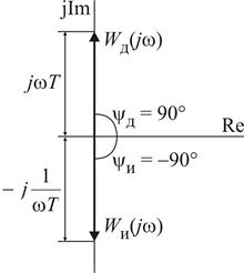 Фазы векторов частотных функций звеньев не зависят от частоты и составляют: для дифференцирующего звена ψд = 90º, для интегрирующего звена ψд = 90º.