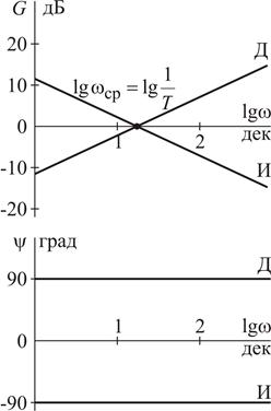 При решении практических задач для построения ЛАЧХ дифференцирующего или интегрирующего звена вычисляется логарифм частоты среза, на оси абсцисс откладывается величина lgωср и через эту точку проводится прямая линия с наклоном +20 дБ/дек для дифференцирующего звена и –20 дБ/дек для интегрирующего звена.