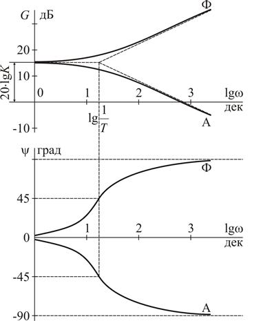 Для рассматриваемых звеньев, во избежание громоздких вычислений, можно использовать упрощенные ЛАЧХ, составленные из двух линейных отрезков. Горизонтальный отрезок располагают на уровне 20×lg K. Аналитические выражения для наклонных отрезков могут быть получены из второго слагаемого формулы ЛАЧХ, если пренебречь единицей под знаком корня: