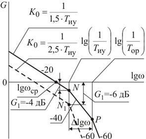 При равенстве постоянных времени Т иу = Т ор наклон отрезка NP составляет –60 дБ/дек. График ЛАЧХ выделен штриховой линией. Ордината точки сопряжения N при общем коэффициенте усиления системы