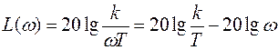 В области низких частот w < 1 и в области высоких частот w > 1 вид функции один и тот же. Зависимость представляет собой прямую, которая пересекает ординату в точке с координатами lg w = 0, L (w) = 20 k / T и абсциссу в точке с координатами lg w = lg (k / T), L(w) = 0. Рис 3.5.
