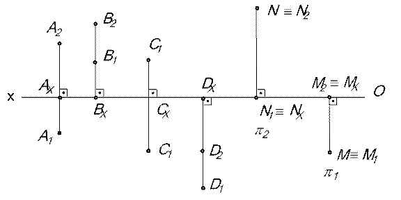 Ортогональные проекции точки на две взаимно перпендикулярные плоскости вполне определяют положение точки в пространстве.
