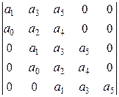 Намечают n строк и n столбцов (n – степень характеристического уравнения). В первый строке ставят все нечетные коэффициенты: a 1, a 3, a 5. По главной диагонали, начиная с коэффициента a 1, слева-вниз-направо располагают последовательно все остальные коэффициенты. Столбцы, начиная с главной диагонали, заполняются вверх по нарастающим индексам, вниз - по убывающим. Все коэффициенты с индексами ниже нуля и выше степени уравнения, заменяют нулями.