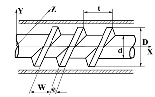 1. Образуется прямой потов, в результате вращения шнек-винта по каналу прямоугольного сечения межвиткового пространства от входа шнека к выходу по принципу “ болт-гайка”.