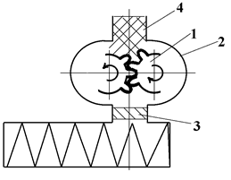 1 – корпус; 2 – ротор; 3 – пластины; 4 – пружины, прижимающие пластины к корпусу. Ротор смещен относительно корпуса на величину