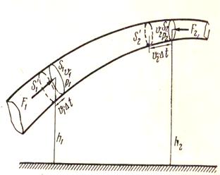 Пусть по наклонной трубке тока переменного сечения движется жидкость в направлении слева направо. Мысленно выделим область трубки, ограниченную сечениями
