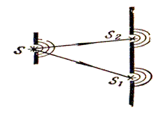 В соответствии с принципом Гюйгенса-Френеля источник света S создает в отверстиях экрана вторичные источники света S1 и S2, которые являются когерентными.