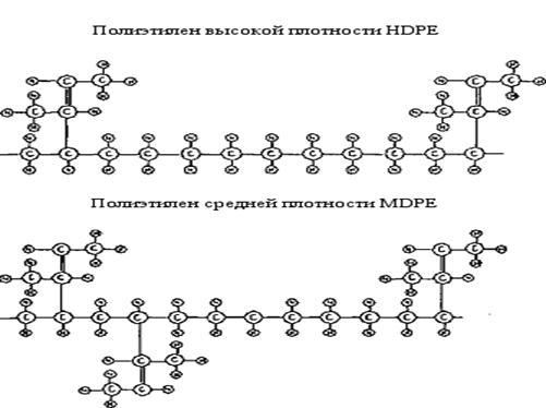 Линейный полиэтилен высокого давления (ЛПЭВД) подобен по структуре полиэтилену низкого давления, но имеет более многочисленные и длинные боковые ответвления (рис.).