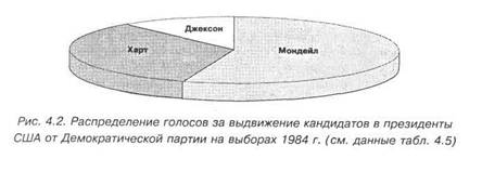 На рис. 4.2 мы видим другую форму графического представления данных. Здесь приведена круговая диаграмма15 реестра голосов, поданных на выдвижении кандидатов в президенты демократами в 1984 г. (табл. 4.5).