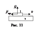 Сила сухого трения возникает между твердыми телами, контактирующими друг с другом вдоль некоторой поверхности. Она вызвана тем, что шероховатости поверхности одного тела, цепляясь за шероховатости поверхности другого тела, препятствуют их скольжению друг относительно друга. Рис.11 иллюстрирует рассматриваемую ситуацию: тело 1 движется со скоростью