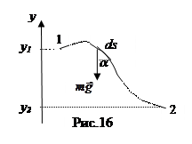 и элементарное перемещение ds (для наглядности пренебрегли математической строгостью, нарисовав его) образуют угол a. Вычислим работу силы тяжести, учитывая, что ds.соsa=- dy: