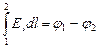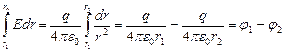 2. Воспользуемся формулой (7.4.8) и получим формулу потенциала поля точечного заряда из формулы напряженности (см. формулы 7.2.2 и 7.2.3). Перемещение dl выберемвдоль направления вектора напряженности (dl= dr), тогда El=E=q/ (4p e0r2). Положения точек 1 и 2 задано соответственно r1 и r2.