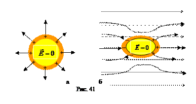 тельный заряд, и этот заряд распределился в тонком поверхностном слое, создав вне проводника свое электрическое поле. На рис.41 – б в однородное электрическое поле (его силовые линии показаны тонкими пунктирными линиями) внесли незаряженный металлический проводник. Смещение свободных электронов против поля привело к возникновению на одной стороне поверхности нескомпенсированного отрицательного заряда, а на противоположной стороне – равного ему по величине положительного. Эти заряды называются индуцированными, а физическое явление их возникновения называется электростатической индукцией. Суммарное поле, разумеется, отличается от исходного. На рисунке его силовые линии изображены черными сплошными линиями. Если помещенный в поле проводник разделить на две части (левую и правую на нашем рисунке) и разъединить их, то получим два разноименно заряженных тела, даже если их удалить их внешнего поля.