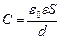 Рассмотрим плоский конденсатор с площадью пластин S и расстоянием между пластинами d. Если расстояние между пластинами мало по сравнению с линейными размерами пластин, то поле такого конденсатора можно считать однородным (см. §7.3 пример в). Его напряженность E=s / e0e. Напряжение на конденсаторе U=Еd==sd / e0e.. Учитывая, что s = q/d, получаем формулу емкости плоского конденсатора: