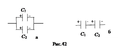 3. При параллельном соединении конденсаторов их одноименно заряженные пластины соединяются между собой (рис. 42 а). Заряд батареи конденсаторов складывается из зарядов отдельных конденсаторов, напряжение на батарее и на каждом конденсаторе одно и то же, и емкости складываются: