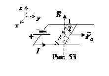 контур с постоянным током в однородном магнитном поле (рис. 53). Пусть плоскость контура перпендикулярна силовым линиям, одна его сторона подвижная (вспомните лекционную демонстрацию «Станок Ампера»). На правую сторону рамки, длина которой l, действует сила Ампера Fa=IBl и перемещает ее из положения 1 в положение 2 на расстояние dy. Работа силы dA= Fady =IBldy. Учитывая, что Bldy=BdS=dФ [36], получили формулу работы в магнитном поле