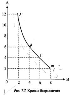 Кривая безразличия (рис. 7.3) показывает все возможные комбинации двух благ, доставляющие потребителю равные полезности.