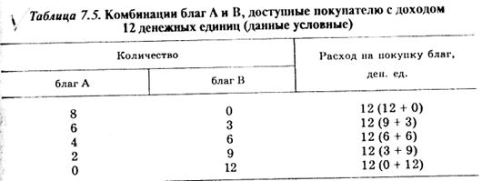 Например, если благо А стоит 1.5 денежной единицы, а благо В — 1 денежную единицу, то потребитель X при доходе 12 денежных единиц может приобрести комбинации благ A и В, которые приведены в табл. 7.5.
