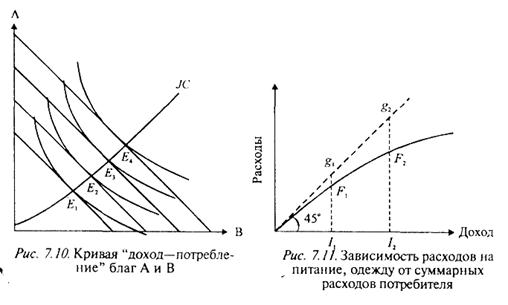 Кривые "доход—расходы" называют кривыми Энгеля в честь немецкого статистика XIX в., который задолго до теоретических исследований потребления на основе статистических данных установил зависимость характера потребления от дохода. Исследование семейных бюджетов потребителей ряда стран в разные периоды времени позволило Э. Энгелю (1821 — 1896) сделать вывод о том, что чем меньше доход, тем большая его часть тратится на питание. Это теоретическое положение вошло в историю экономической науки как закон Энгеля. Оно используется в настоящее время в международной статистике для характеристики уровня благосостояния семьи.