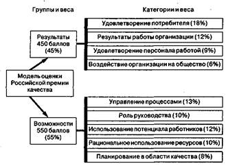 Модель оценки организации, претендующей на Российскую премию качества, близка к модели EQA. Она также характеризуется девятью критериями, которые дают возможные направления совершенствования деятельности организации и ориентиры для ее улучшения (рис. 2).