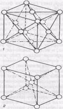 Элементарная ячейка (схема, расстояния между атомами преувеличены): 1 — кубическая гранецентрированная решетка; 2 — кубическая объемно-центрированная решетка