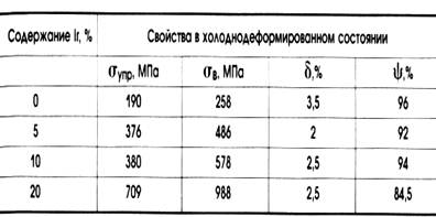 Сплавы с 5 и 10% 1г при холодной прокатке допускают обжатие в 75% между промежуточными отжигами, а сплав с 25 % 1г - только в 50%, Холодная деформация заметно повышает прочностные характеристики, но резко снижает (от 20 - 32% до 2-2,5%) относительное удлинение сплавов.