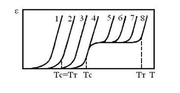 На рис.13 показано семейство термомеханических кривых для образцов различных членов полимергомологического ряда. Из рисунка видно, что низкомолекулярные полимергомологи могут находиться только в двух состояниях: стеклообразном и вязкотекучем (иными словами, их ТС и ТТ совпадают).