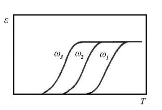 | Рис.22 Зависимость амплитуды деформации полимера ε от температуры при различных частотах действия силы ω (ω 1> ω2 > ω3). |