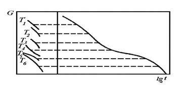 | Рис.23 Обобщенная кривая релаксации напряжения полимера. Слева на рисунке кривые релаксации напряжения полимера при различных температурах (Т6 > Т5 > Т4 > Т2 > Т1). |