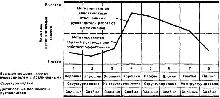 В противоположность этому, ситуация 8 – наименее благоприятная, потому что должностные полномочия невелики, отношения с подчиненными плохие и задача не структурирована. Любопытно, что результаты исследований Фидлера показывают, что самым эффективным стилем руководства в обоих этих крайних случаях будет ориентация на задачу.