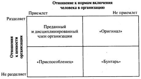 Второй и четвертый типы позволяют человеку адаптироваться и включиться в организацию, хотя они и приводят к существенно различным результатам включения. Нельзя сказать, что какой-то из этих двух типов лучше, так как оценка принципиально зависит от того, в какую организацию входит человек. В бюрократических организациях, в организациях, в которых доминирует стандартизированная деятельность, где не требуются изобретательность, самостоятельность и оригинальность поведения, может быть лучше и быстрее принят человек, воспринимающий все ее нормы и принципы. В предпринимательских и творческих организациях, где индивидуальность поведения может давать свои положительные результаты, адаптивный индивидуализм в большинстве случаев может рассматриваться как лучший путь восприятия человеком системы норм и ценностей организации.