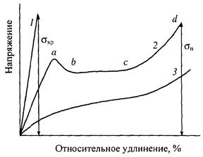 При Тс > Т > Tхр (кривая 2) в начальный период деформации полимер ведет себя так же как упругое тело, деформация полностью обратима. Далее, когда относительная деформация достигает нескольких процентов, рост напряжения деформируемого образца замедляется, и в некоторых случаях даже может наблюдаться его спад, далее деформация развивается при постоянном напряжении. Уменьшение темпа роста напряжения соответствует началу развития необратимой деформации, т.е. течения полимера. Максимальное значение напряжения, соответствующее области перехода обратимой деформации в необратимую, называется пределом текучести σт. Резкое падение напряжения на зависимости σ-ε, после достижения предела текучести, называется деформационным размягчением. Оно обусловлено выделением упругой энергии, запасенной при упругом деформировании полимера.