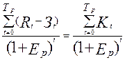 Если интегральный эффект инвестиций Эи положителен, то индекс рентабельности Эк > 1, и наоборот. При Эк > 1 инвестиционный проект считается экономически эффективным. В противном случае (Эк<1) проект неэффективен. При инвестициях в исходный год К0 и при постоянных во времени результатах затрат и норме дисконта индекс рентабельности определяется выражением:
