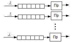 Для многопроцессорных ВС с индивидуальной памятью приходящий запрос поступает в очередь только к тому процессору, в памяти которого находится необходимая для обработки этого запроса программа. Поэтому модель в данном случае отображается без учета внешних устройств в виде совокупности одноканальных СМО. (рис. 1.23).