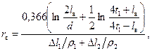 где r1, r2 - удельные сопротивления соответственно верхнего и нижнего слоев земли, Ом×м; Dl 1, Dl 2 - части электродов, находящиеся в верхнем и нижнем слоях земли, м; l в - длина электрода, м; d - внешний диаметр электродов, м; t 1 - глубина заложения, равная расстоянию от поверхности земли до середины электрода, м. Формула справедлива для стержней электродов из круглой стали или труб. При применении уголка для вертикальных электродов в качестве диаметра подставляется эквивалентный диаметр уголка d у.э =0,95 b, где b - ширина сторон уголка.